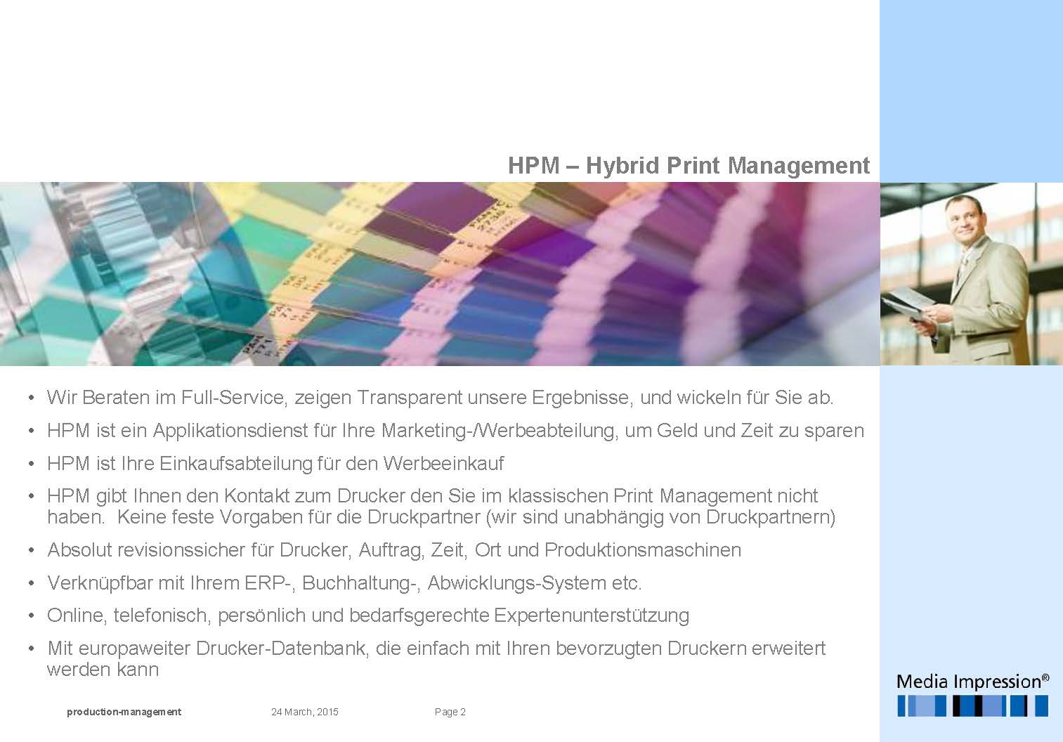 • HPM gibt Ihnen den Kontakt zum Drucker den Sie im klassischen Print Management nicht haben. Keine feste Vorgaben für die Druckpartner (wir sind unabhängig von Druckpartnern)