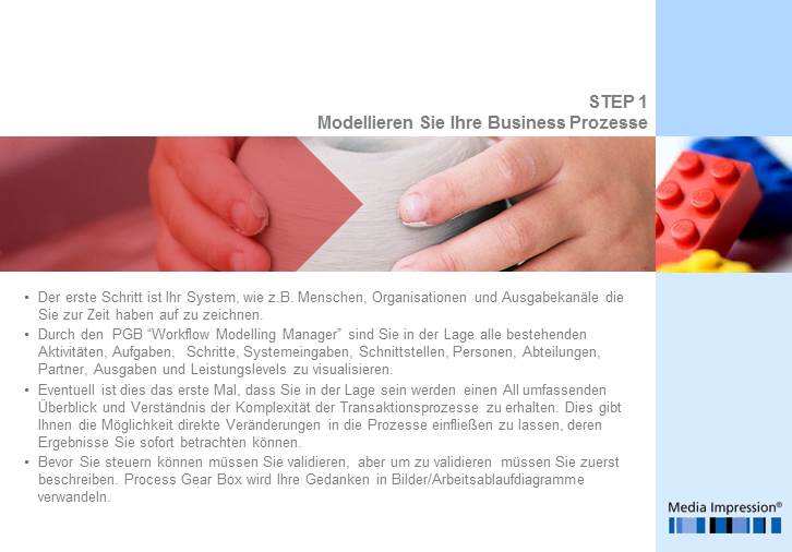 Durch den PGB „Workflow Modelling Manager“ sind Sie in der Lage, alle bestehenden Aktivitäten, Aufgaben, Schritte, Systemeingaben, Schnittstellen, Personen, Abteilungen, Partner, Ausgaben und Leistungslevels zu visualisieren und real zu verknüpfen.