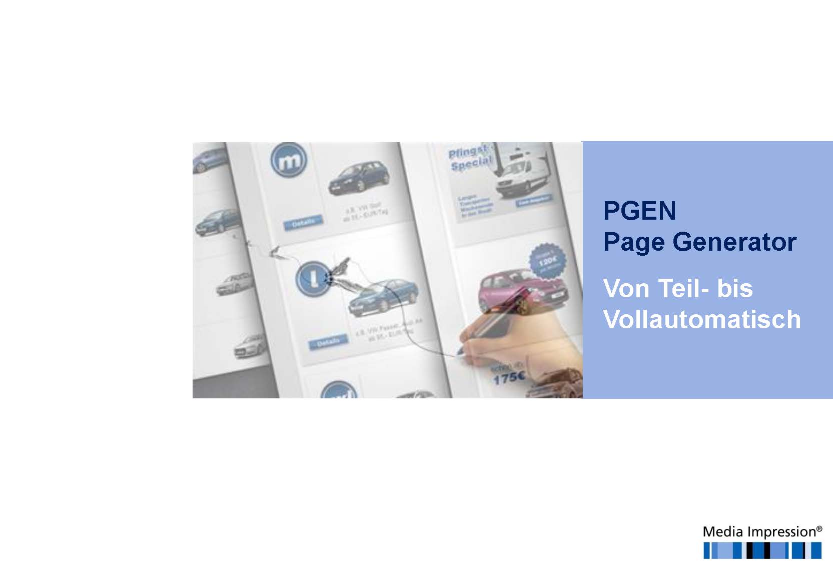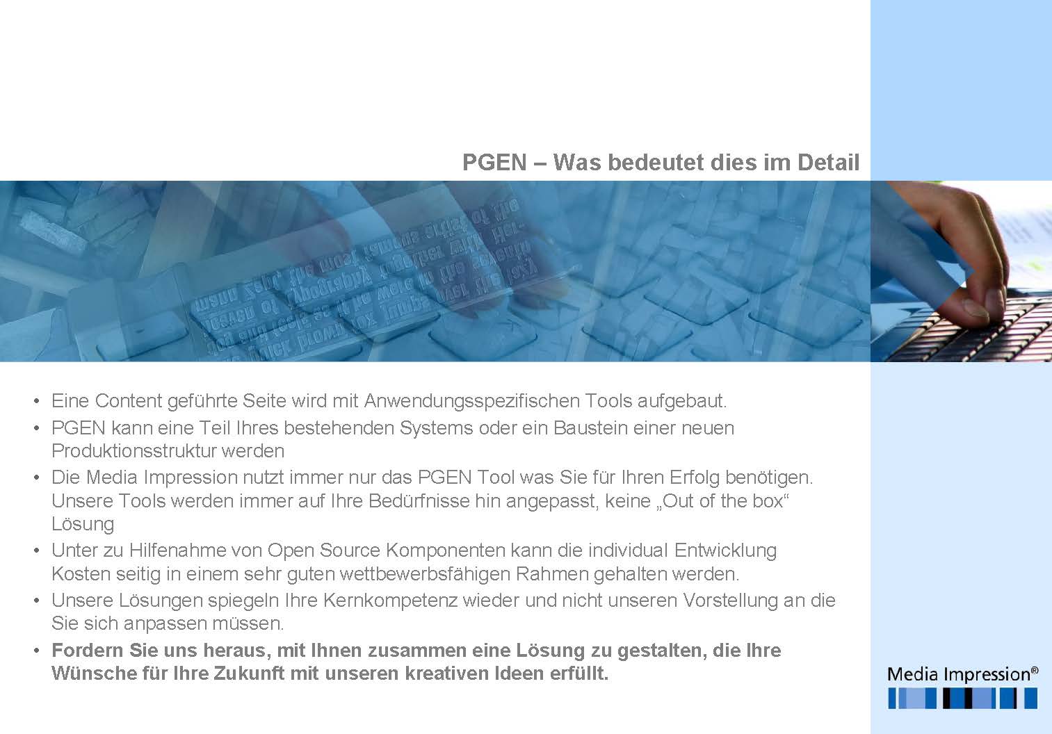 • Die Media Impression nutzt immer nur das PGEN Tool was Sie für Ihren Erfolg benötigen. Unsere Tools werden immer auf Ihre Bedürfnisse hin angepasst, keine „Out of the box“ Lösung
