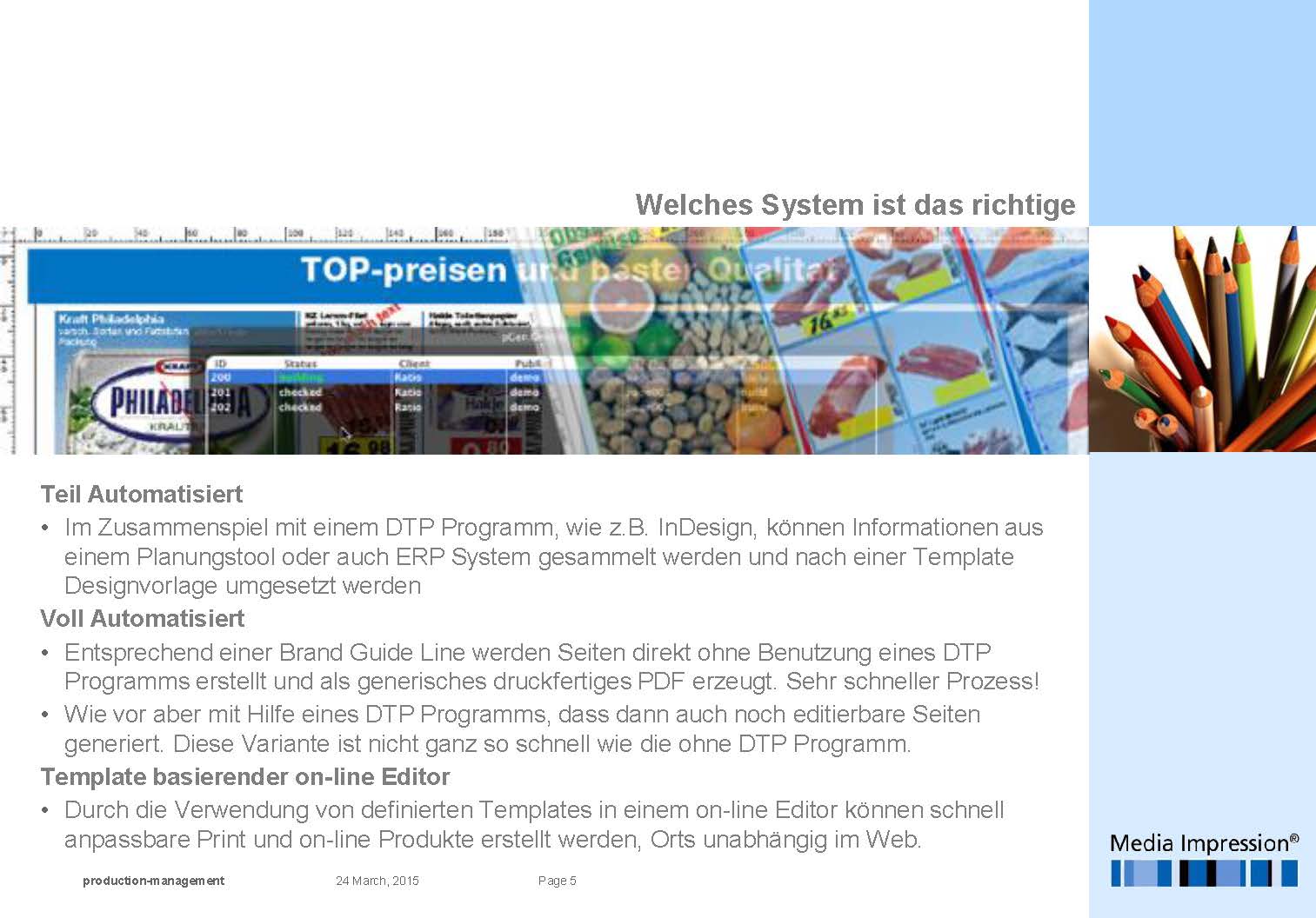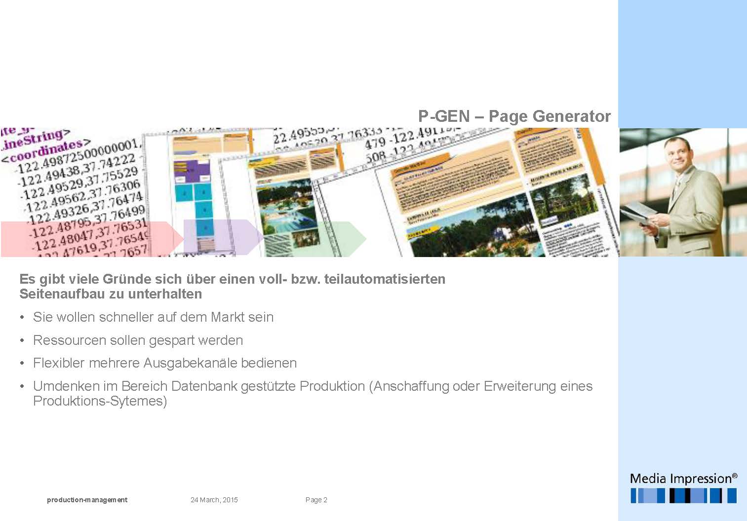 • Entsprechend einer Brand Guide Line werden Seiten direkt ohne Benutzung eines DTP Programms erstellt und als generisches druckfertiges PDF erzeugt. Sehr schneller Prozess!