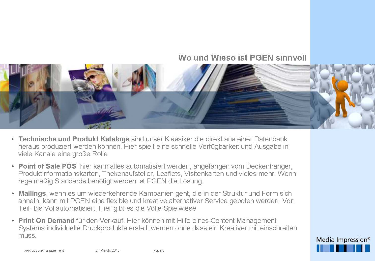 • Point of Sale POS, hier kann alles automatisiert werden, angefangen vom Deckenhänger, Produktinformationskarten, Thekenaufsteller, Leaflets, Visitenkarten und vieles mehr. Wenn regelmäßig Standards benötigt werden ist PGEN die Lösung.