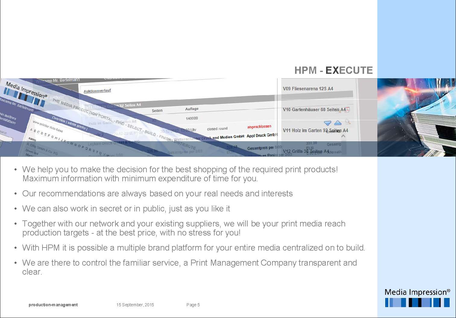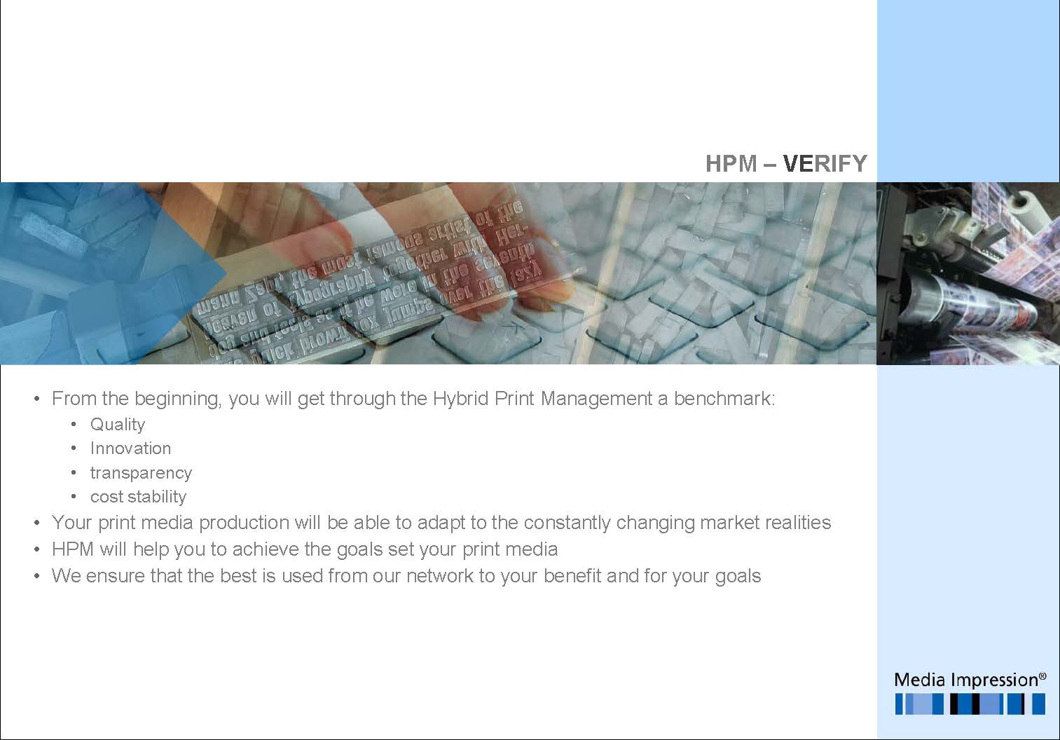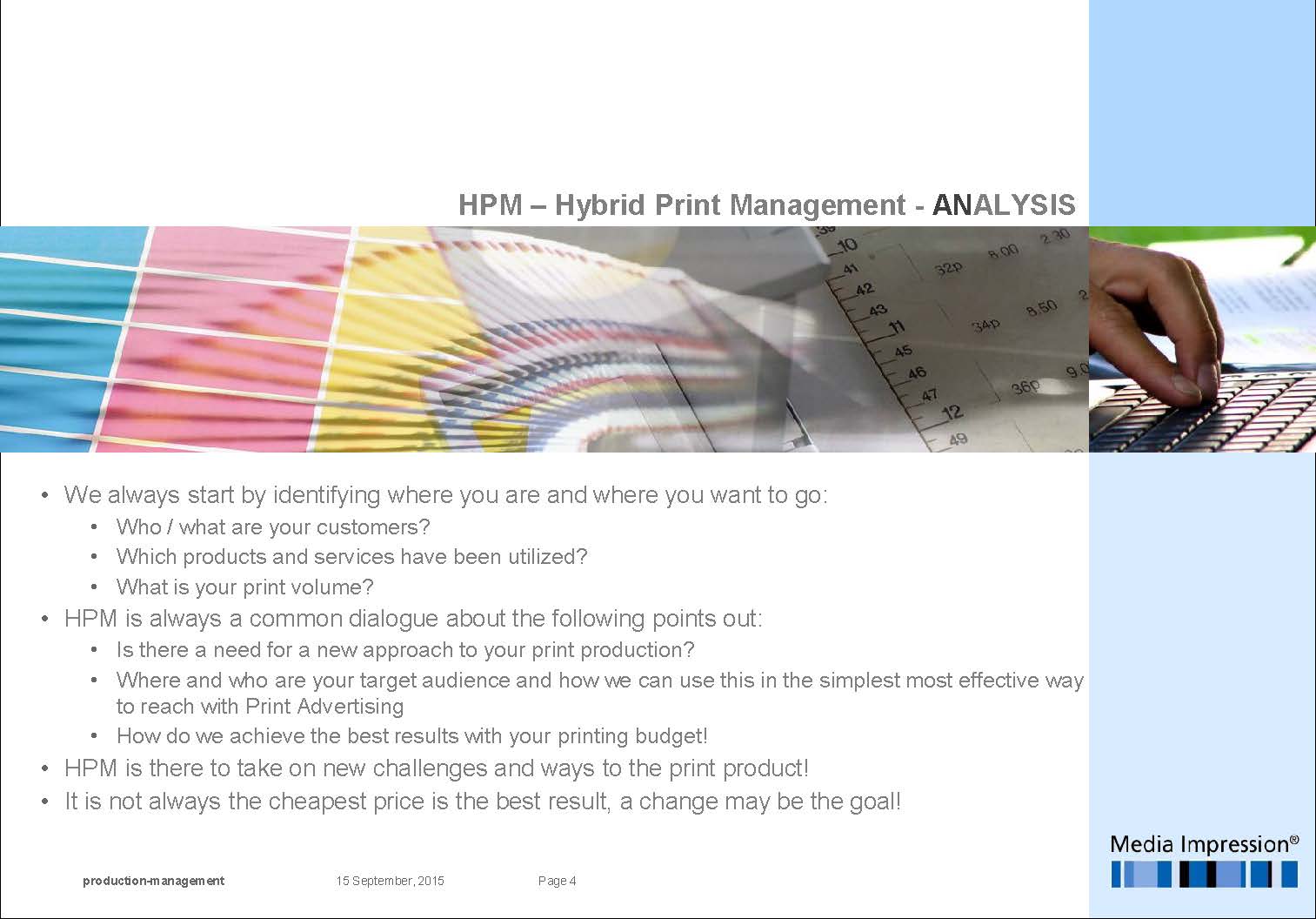 - HPM gives you contact with the printer that you do not have in traditional print management. No firm guidelines for printing partner (we are independent of printing partners)